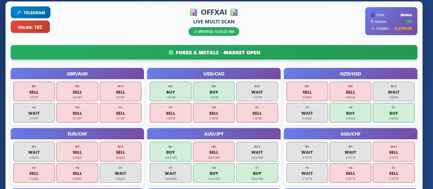 Live Scan is a real-time market scanning system designed for traders who need instant and accurate insights across multiple trading pairs and timeframes. Powered by OFFXAI’s advanced chart analysis engine, Live Scan continuously monitors the market and detects potential trading opportunities as they form.